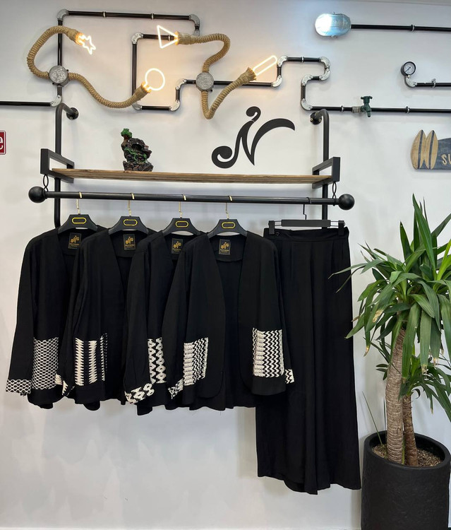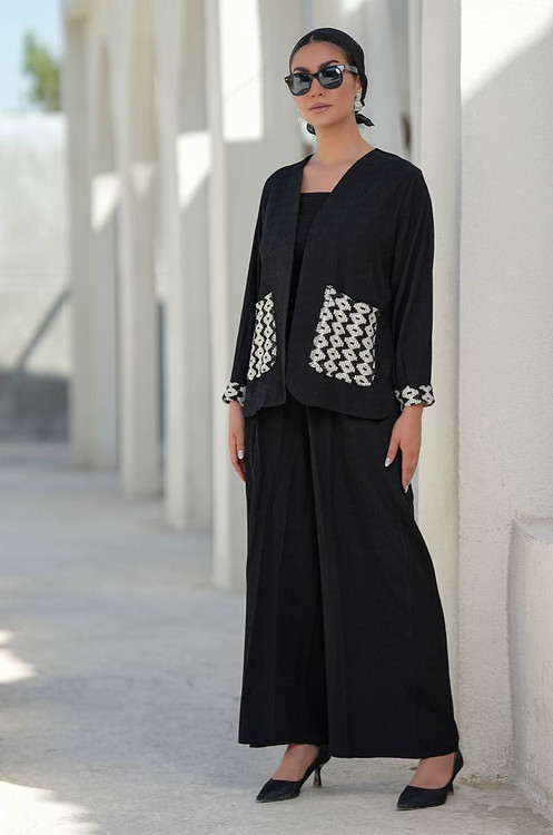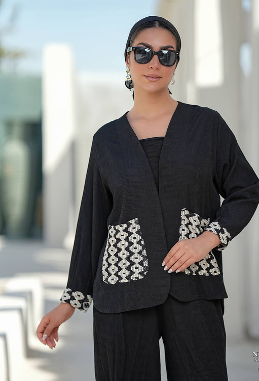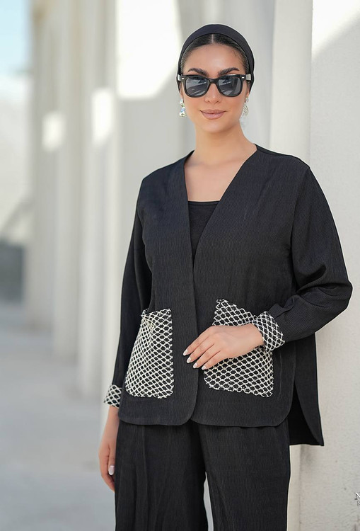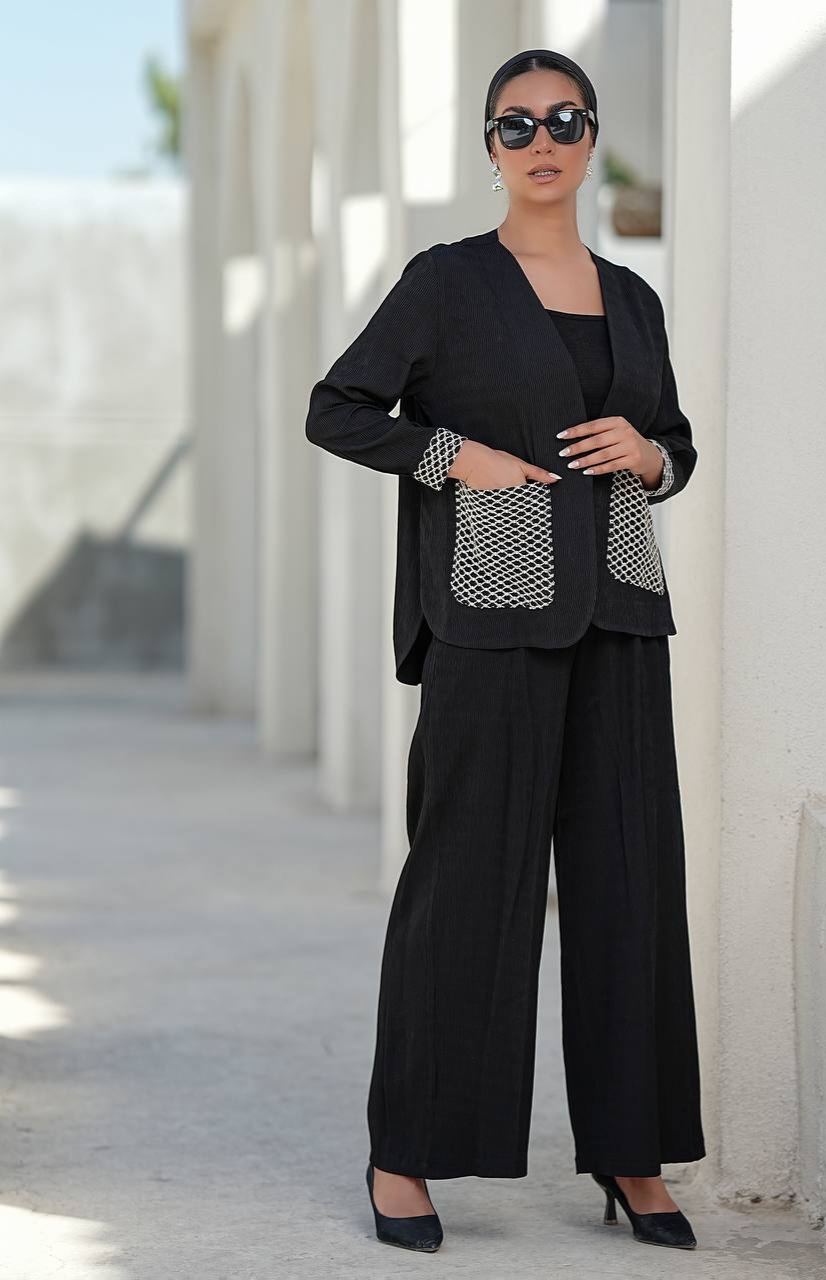 جنس پارچه : مانتوشلوار پلیسه مچ و جیب گیپور